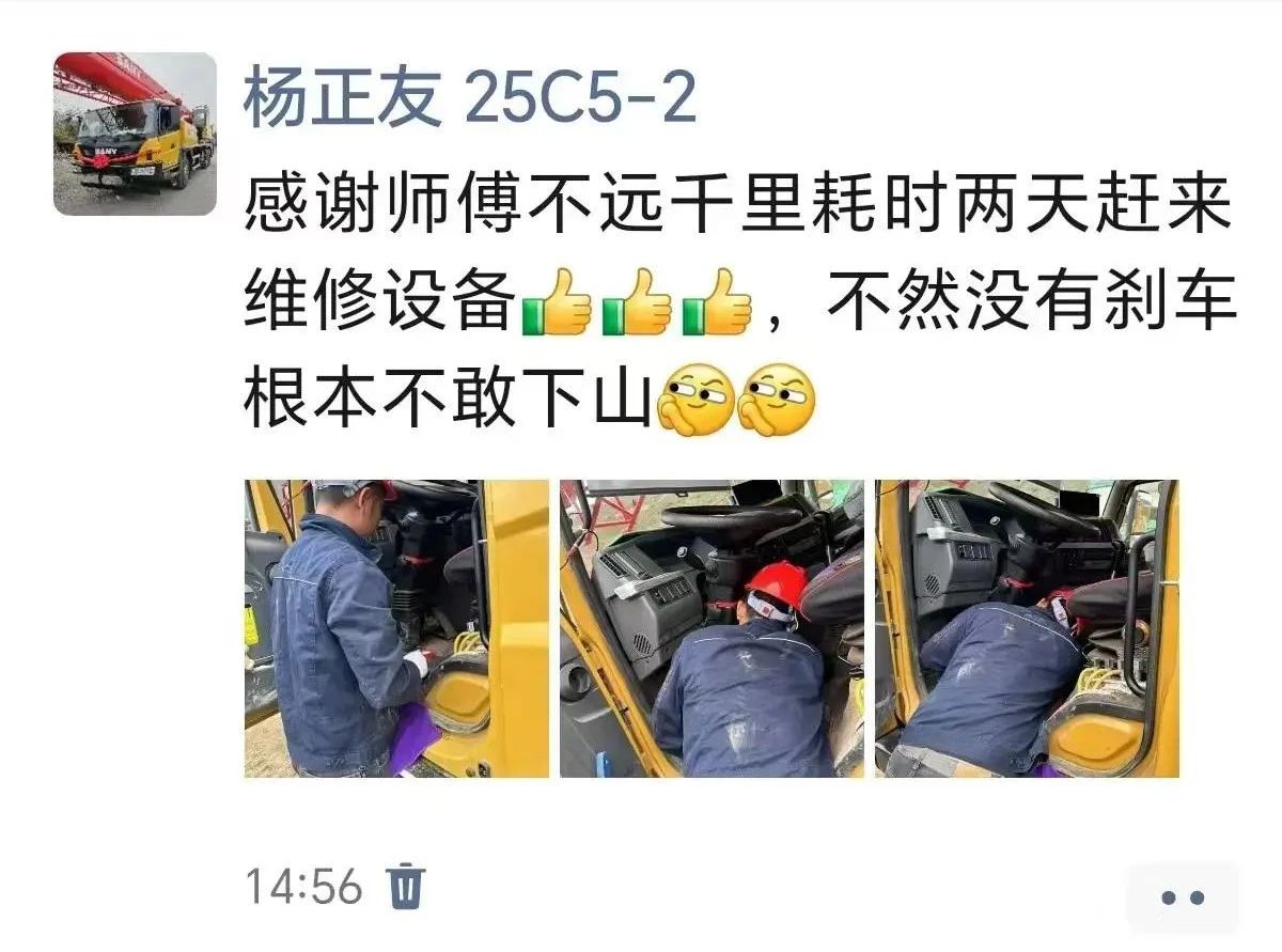 这天,四川服务工程师祁国荧的值班电话突然响起,客户设备刹车气压报警,施工在深山里,不敢启动下车。祁国荧了解完情况后,立即收拾工具出发:“过节是过节,但客户不也没休息吗,我们的职责就是为客户做好保障,尤其是这种特殊的日子,不能让客户等太久,要让他们早点回家。”