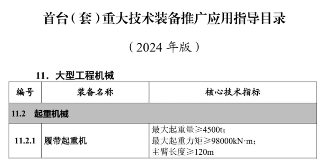 近日,工业和信息化部印发《首台(套)重大技术装备推广应用指导目录(2024年版)》(以下简称《指导目录》),在“大型工程机械”类别下,好体育投注网站自主研发的4500吨履带起重机入选。