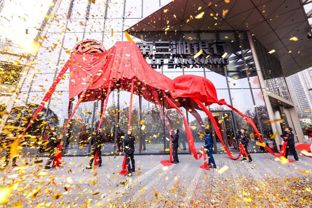 随着礼炮齐鸣、彩带飘扬,在热烈的掌声中,与会嘉宾一同揭开了覆盖在大楼LOGO上的红色绸布,露出了“湖南三湘银行”几个熠熠生辉的大字,象征新的篇章正式开启。