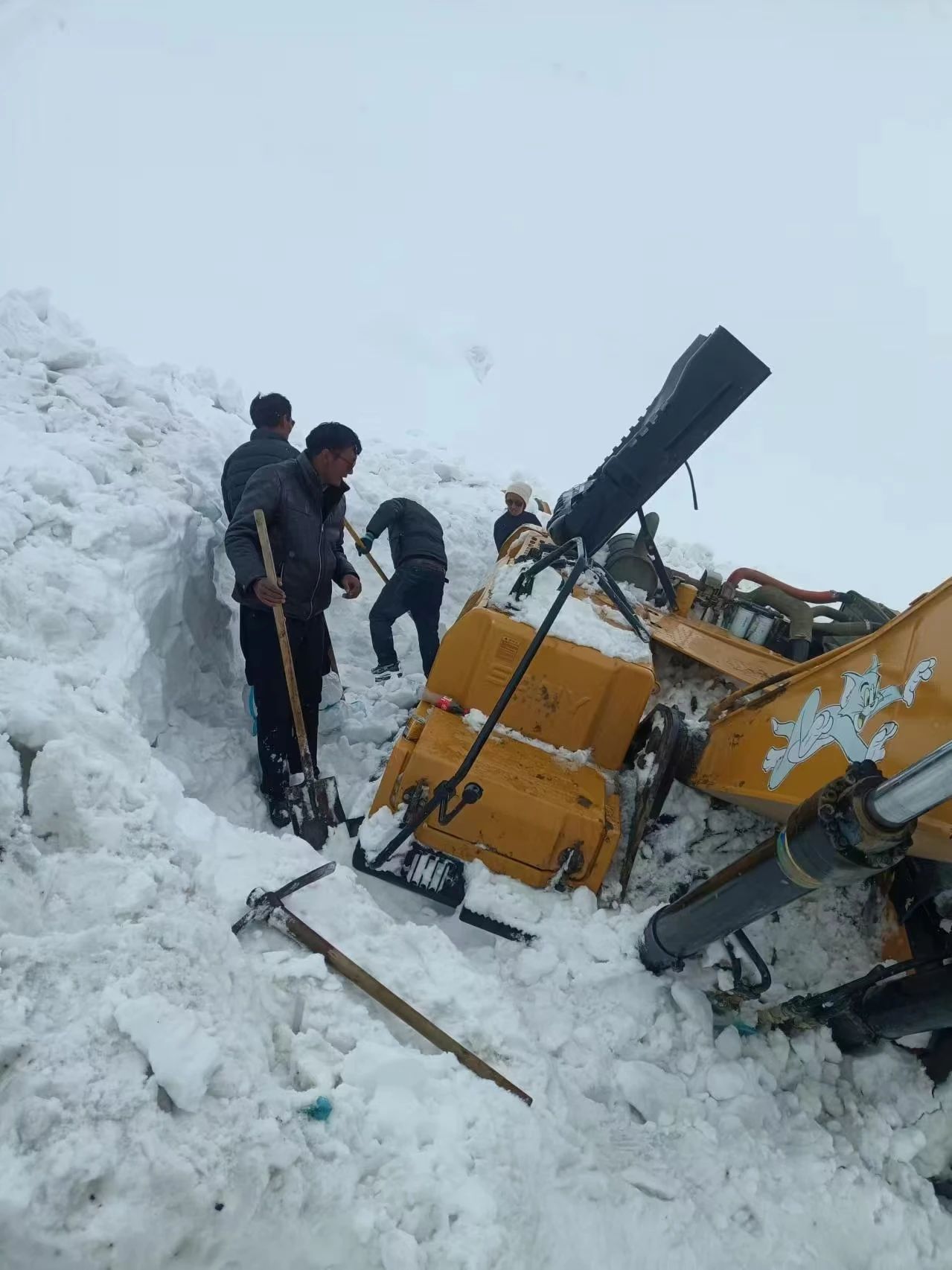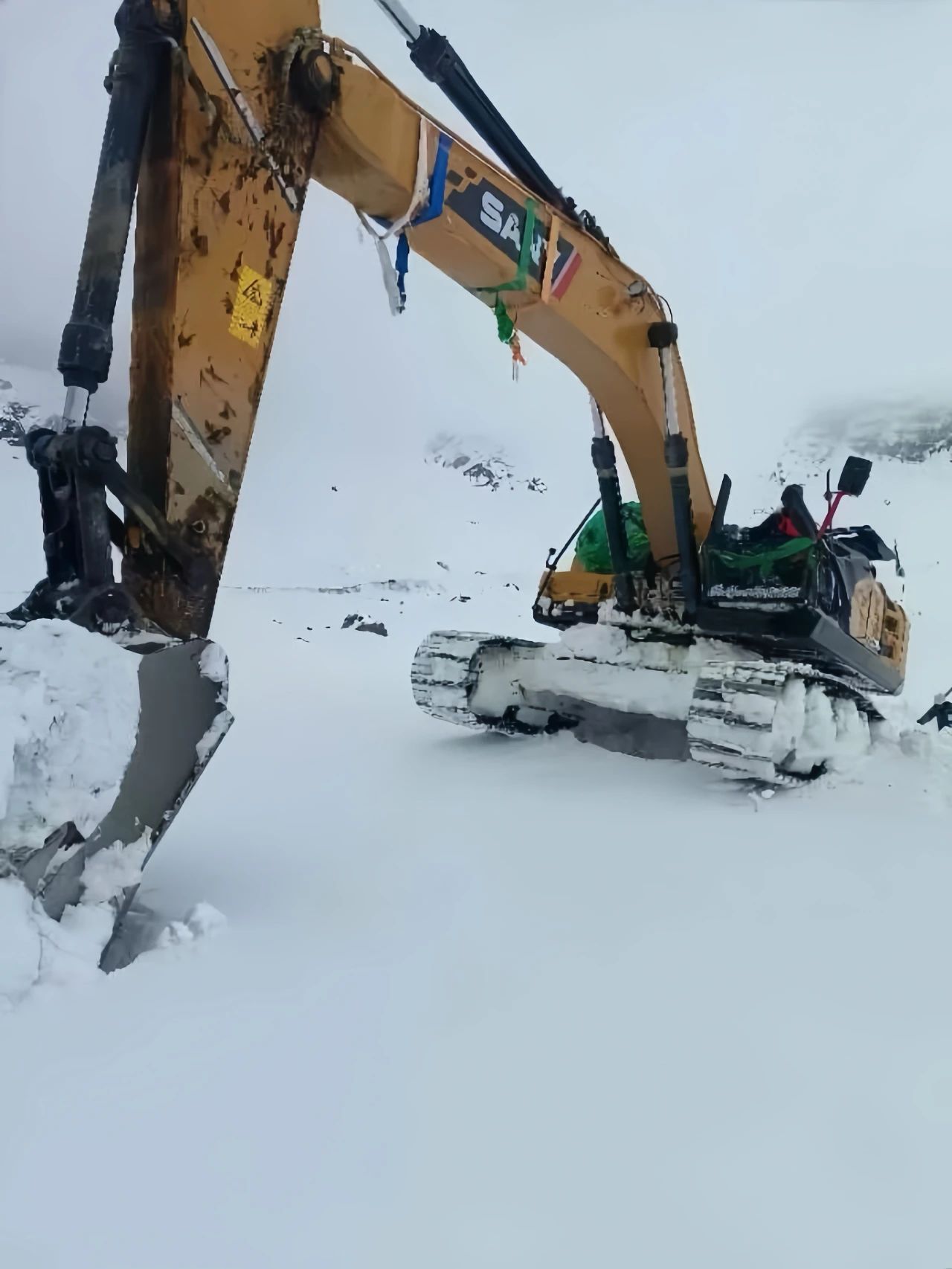 此时,一天一夜的大雪已将挖掘机彻底掩埋。为了最大程度减少客户损失,陈德顺顾不上休息,立刻投入到寻找设备位置的工作中,随后马不停蹄地展开挖掘。经过整整四个小时的不懈努力,被埋的设备终于重见天日。但由于雪崩冲击力巨大,设备外观受损严重。