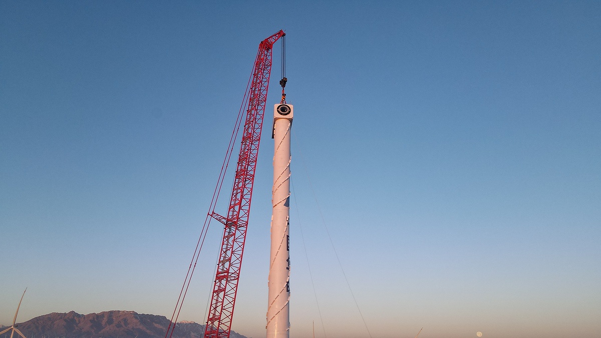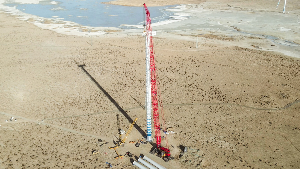 达坂城风电厂位于新疆维吾尔自治区乌鲁木齐市东南方约 50 公里处的达坂城区,是中国最大的风能基地,风区面积达 2118 平方公里,可装机面积在 1500 平方公里以上,年平均风速 6.4 米 / 秒,风能年蕴藏量 250 亿千瓦时,风力发电风效标准利用小时数可达 3300 小时。本次由全国首台SCC18000TM-8履带起重机吊装一个高125米,最重机舱达到200吨的10MW风机,由于现场白天风力太大,所有吊装工作都只能在夜里进行