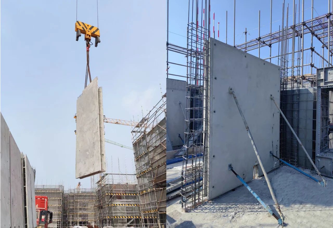 在项目施工现场,随着塔吊将首块SPCS空腔墙精准就位,完成了SPCS空腔墙构件在该项目的首吊工作。SPCS构件采用工厂化预制,现场仅需吊装与后浇连接,全程耗时较传统工艺缩短30%,且全程数字化监控,确保毫米级精度。SPCS结构技术大幅减少了现场模板搭设、钢筋绑扎等作业,既保障了施工安全,又提升了工程品质,为后续施工奠定坚实基础。
