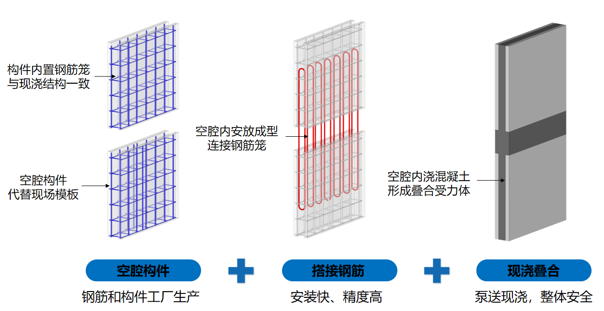 项目住宅塔楼采用SPCS结构技术体系,通过标准化、流程化的设计和施工,可实现4-5天/层的施工效率,具有“空腔搭接加后浇、等效异构好快省”的优势,能够实现“墙柱梁板全预制、地上地下全装配”。通过提前预埋连接钢筋,确保上下层墙体的有效连接,吊装施工简单,工人上手快,能够快速推进施工进度,大大提高施工效率。