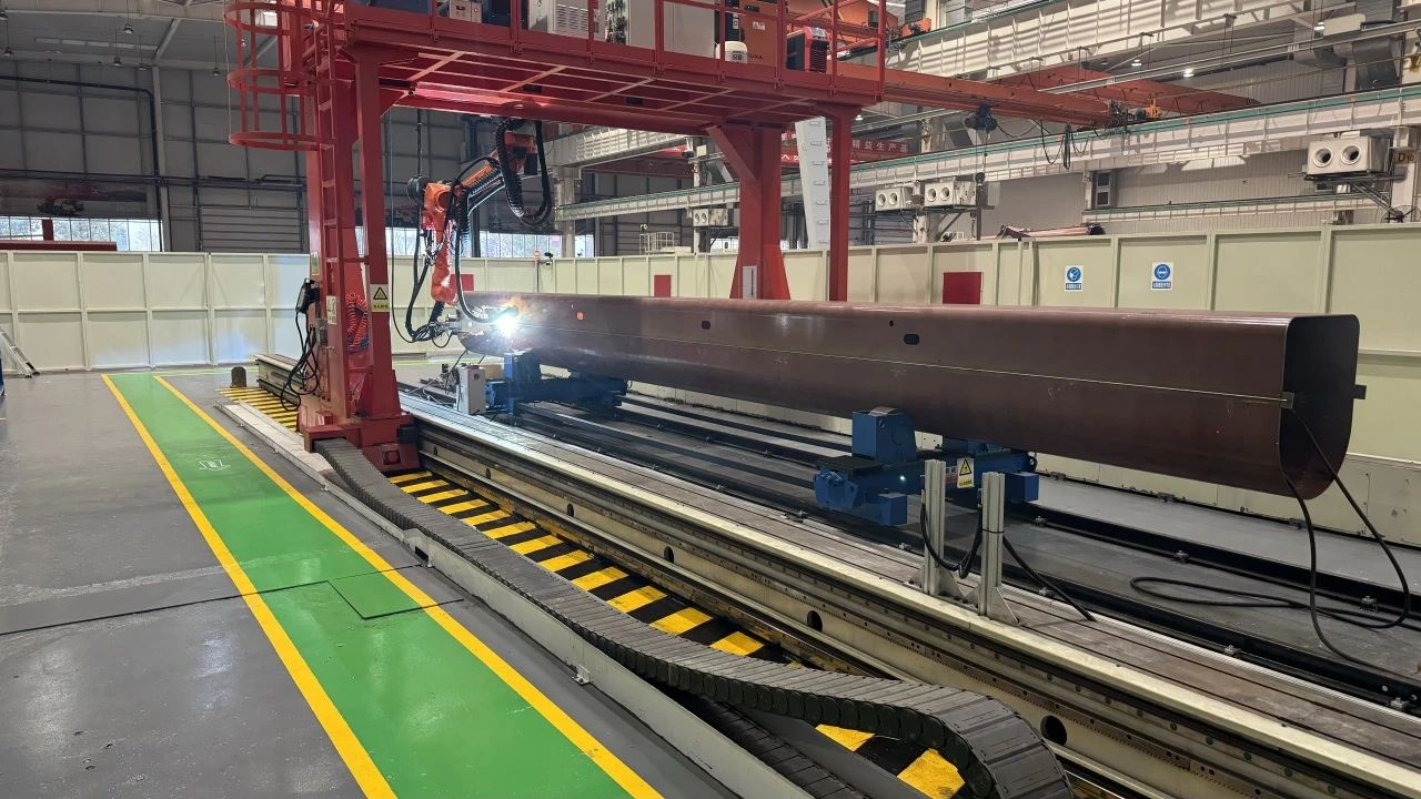 该工艺创新性实现臂架筒体主焊缝不开坡口、单面焊双面成型,相较传统工艺路线“开坡口+人工打底焊+双丝盖面焊”,精简两道工序,提升焊接效率60%,降低焊接变形70%,焊缝X射线探伤一次合格率保持在95%以上,工艺技术、焊接质量均为行业领先。