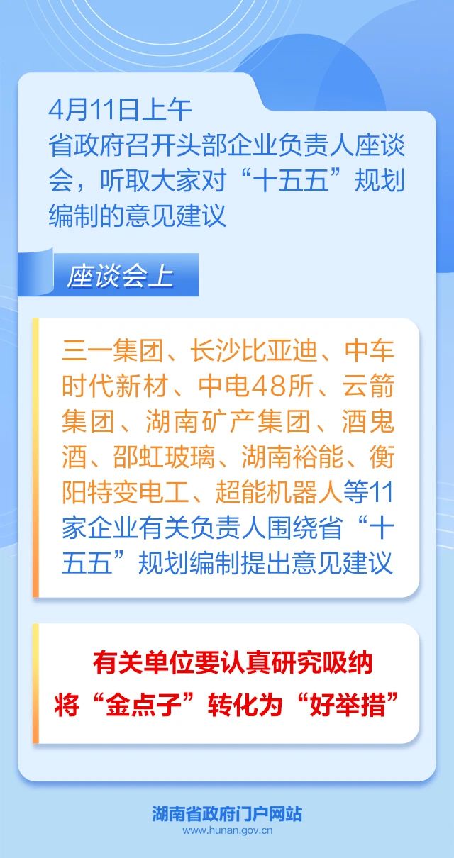 4月11日上午,省政府召开头部企业负责人座谈会,听取大家对“十五五”规划编制的意见建议。省委副书记、省长毛伟明强调,要深入贯彻习近平总书记关于湖南工作的重要讲话和指示批示精神,秉持产业报国之志,当好实干家、主力军、开拓者、代言人,奋勇争先、高质赶超,为收官“十四五”、开篇“十五五”贡献力量。