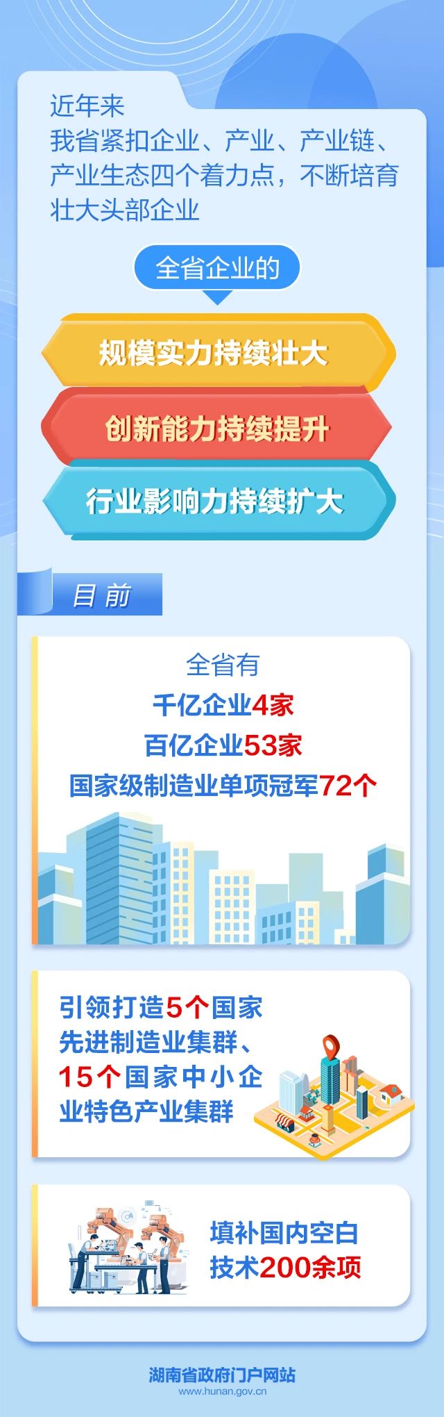 近年来,我省紧扣企业、产业、产业链、产业生态四个着力点,不断培育壮大头部企业,全省企业的规模实力持续壮大,创新能力持续提升,行业影响力持续扩大。目前,全省有千亿企业4家、百亿企业53家、国家级制造业单项冠军72个,引领打造5个国家先进制造业集群、15个国家中小企业特色产业集群;填补国内空白技术200余项。