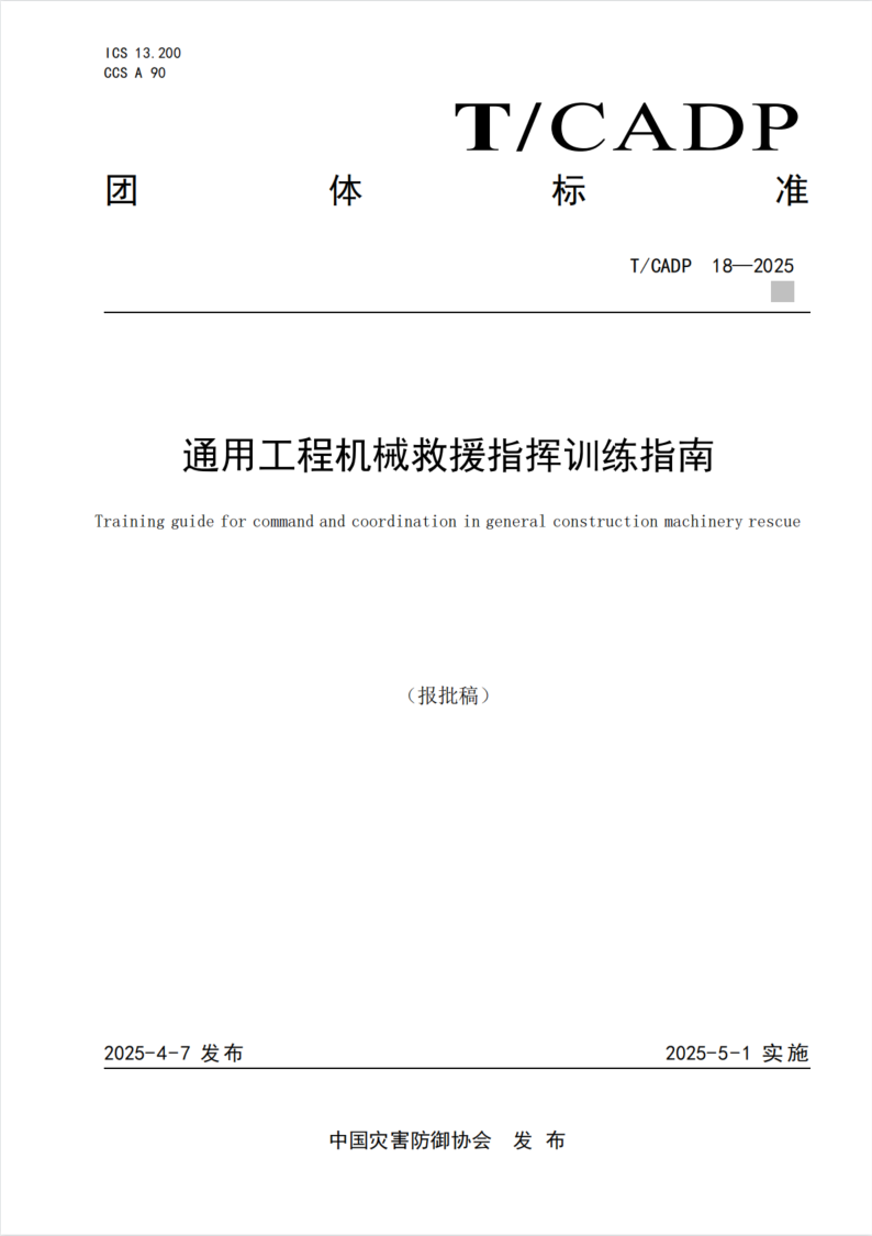 近日,中国灾害防御协会批准发布《通用工程机械救援基本要求》(以下简称《要求》)《通用工程机械救援指挥训练指南》(以下简称《指南》)两项团体标准,标准编号分别为 T/CADP 17-2025、T/CADP 18-2025,将于2025年5月1日起实施。