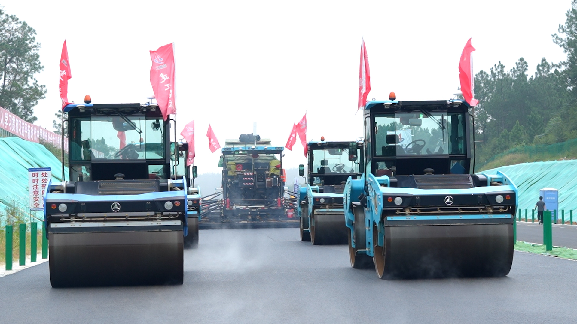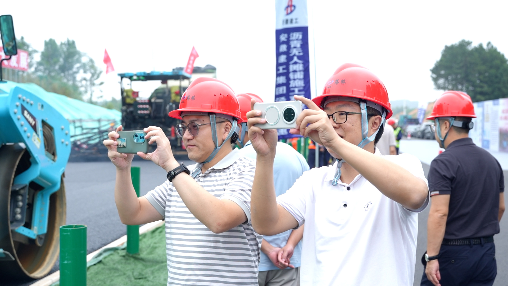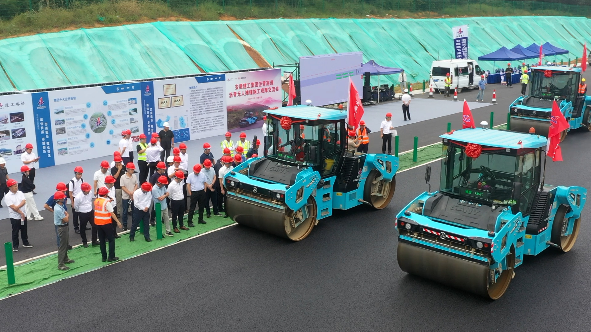 广东省观摩团一行深入泾青高速K12+400至K12+800段施工现场,驻足观看无人摊铺与碾压协同作业实况。现场部署的1台13米无人摊铺机与4台13吨无人双钢轮压路机全部实现无人驾驶,压路机群与摊铺机紧密配合,实现“紧跟慢压”,充分保证沥青碾压温度。同时,严格按照碾压工艺实现“厘米级”精准控制,不但能有效避免漏压、欠压,还可实现“0”贴边碾压,切实保障了施工质量,引发众多嘉宾驻足拍摄与热烈交流。