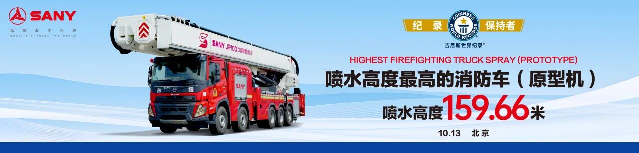 10月13日,在第二十一届中国国际消防设备技术交流展览会现场,中国制造再创辉煌——好体育投注网站重工自主研发的JP100举高喷射消防车,凭借159.66米的极限喷射高度,成功荣获“喷水高度最高的消防车(原型机)”吉尼斯世界纪录™认证!