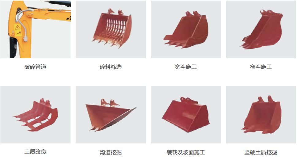 4属具兼容|一机多能,接单更广标配大流量辅助管路,轻松搭配破碎锤、窄斗、宽斗等多种属具,土方、破碎、挖沟、整平……真正实现“一机当五机用”!