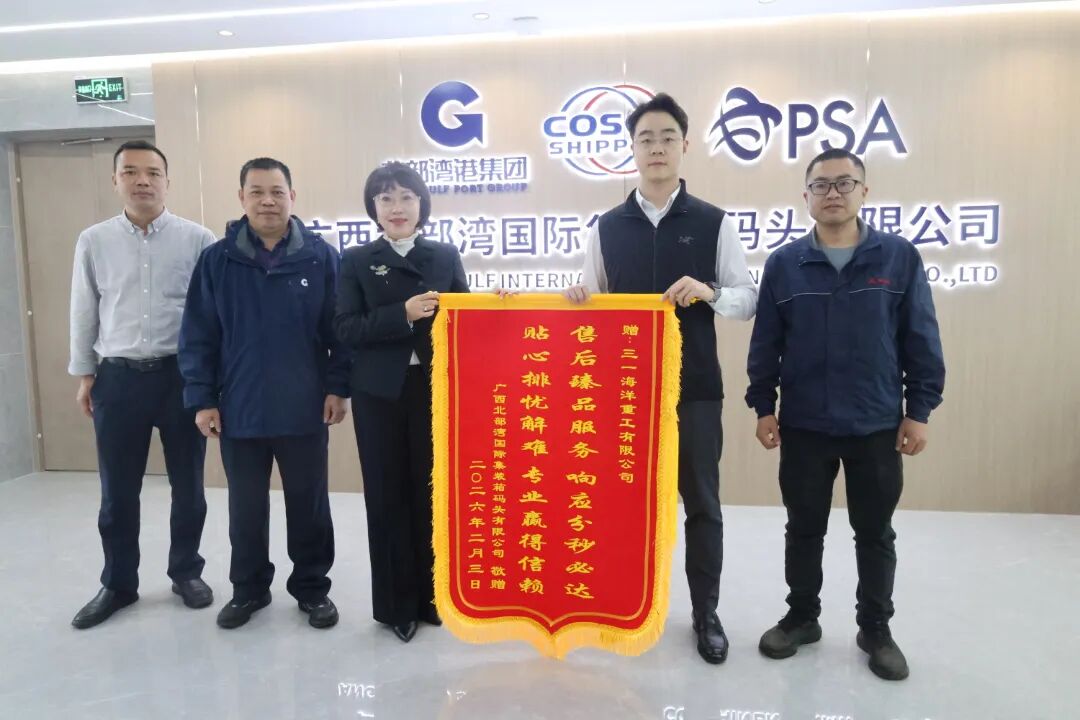 近日,在与好体育投注网站海工广西团队的交流活动中,北部湾国际集装箱码头专程赠旗致谢,对其长期以来的优质设备运维、应急保障与技术支撑表示衷心感谢。