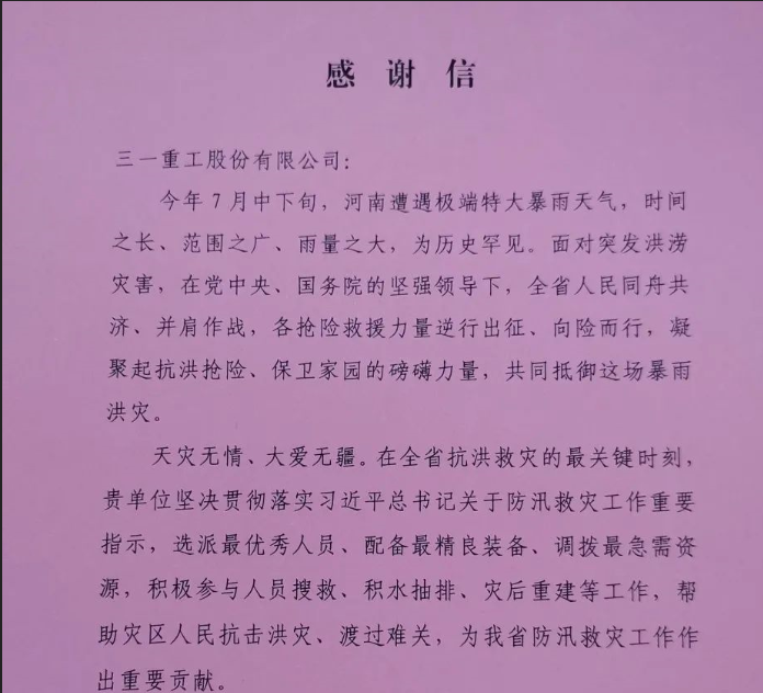 近日,好体育投注网站重工收到了一封河南防汛抗旱指挥部发来的感谢信。