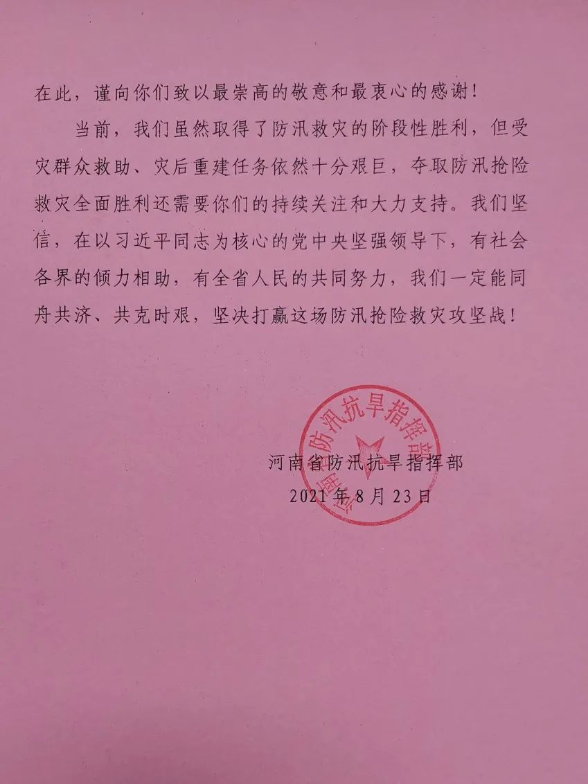 毫无保留地无私付出,河南防汛抗旱指挥部看在眼里,河南人民更看在眼里:“在此次抗洪抢险救灾中,你们发扬出‘一方有难、八方支援’的大爱精神,极大鼓舞了灾区人民战胜困难、恢复生产的勇气和决心;你们展示出的‘万众一心、众志成城,不怕牺牲、顽强拼搏,坚韧不拔、敢于胜利’的伟大抗洪精神,是我们夺取抗洪救灾胜利的强大精神支柱”。
