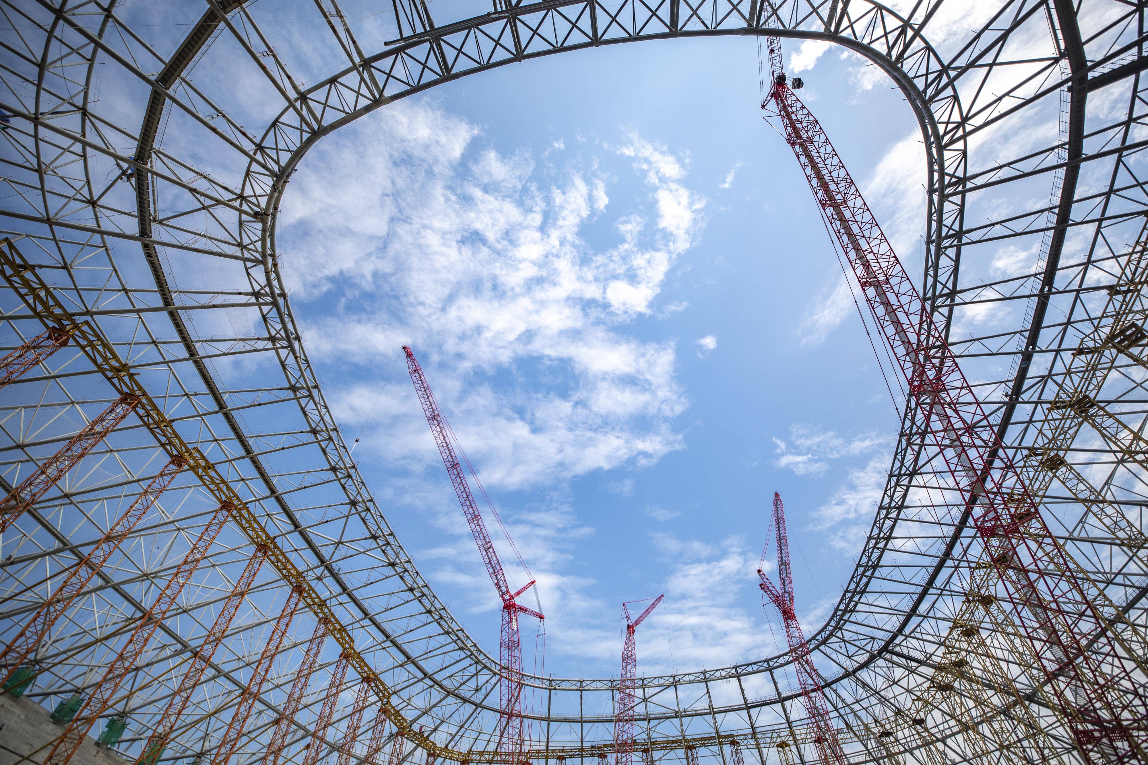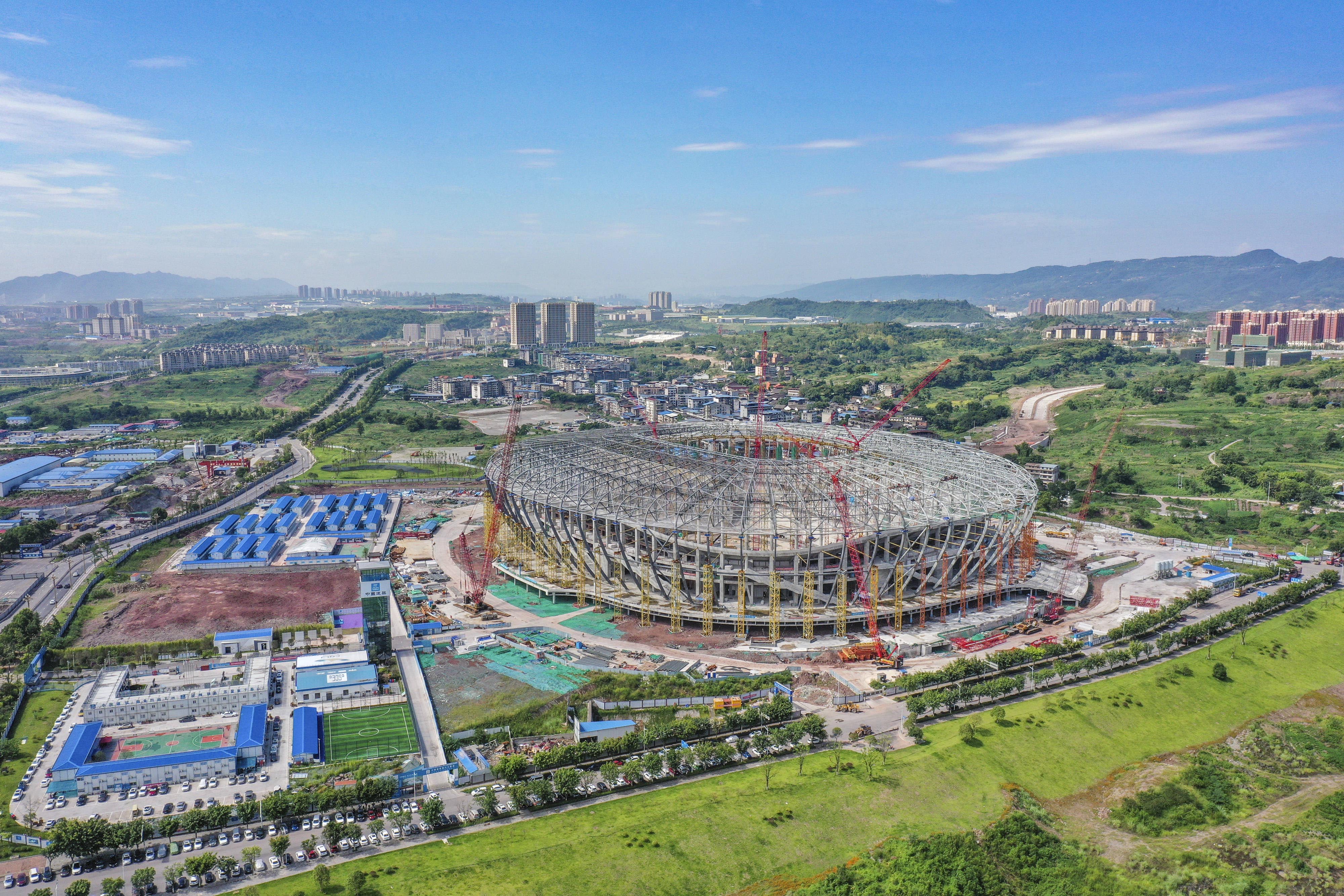 随着足球场结构部分全部完成,环绕足球场一周,径向桁架与环向杆件交织,编绘起足球场绚丽外观结构。8台火红的好体育投注网站履带式起重机与场馆“火凤凰”的设计理念交相呼应,映射出重庆的火热与激情。项目建成后,龙兴足球场将成为国内最大的专业足球场之一,并于2023年承办第十八届亚洲杯足球赛相关赛事。