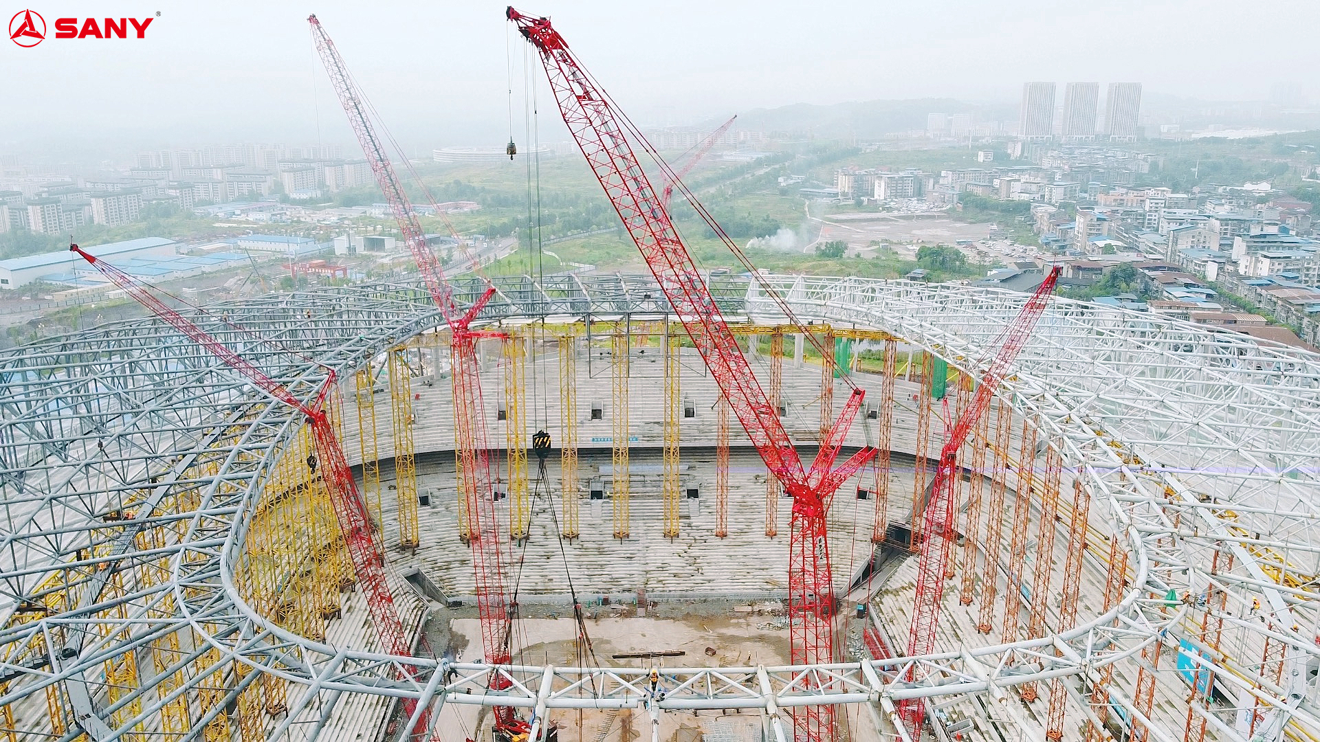 “为保证施工效率,经过多方考虑后我们特选用了2台SCC4000A、2台SCC3200A-1、1台SCC2000A、3台SCC1500A-1共计8台好体育投注网站履带式起重机参与吊装作业。历经112天紧张施工,顺利完成场馆主体钢结构施工,每榀桁架从进场、拼装、吊装、焊接,整个过程所用不到一天半时间。”
