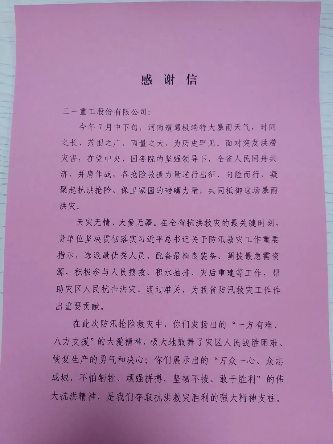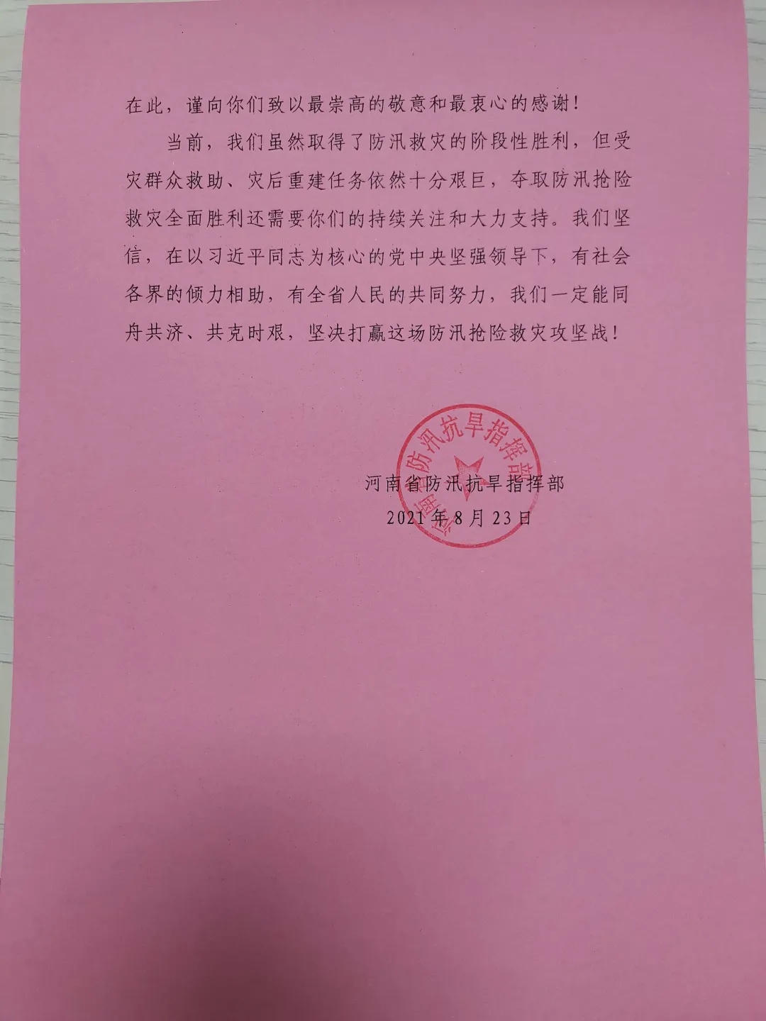 日前,河南省防汛抗旱指挥部发来感谢信。防汛抗旱指挥部对于我们此次汛情期间做出的快速救援响应,予以肯定和表扬。