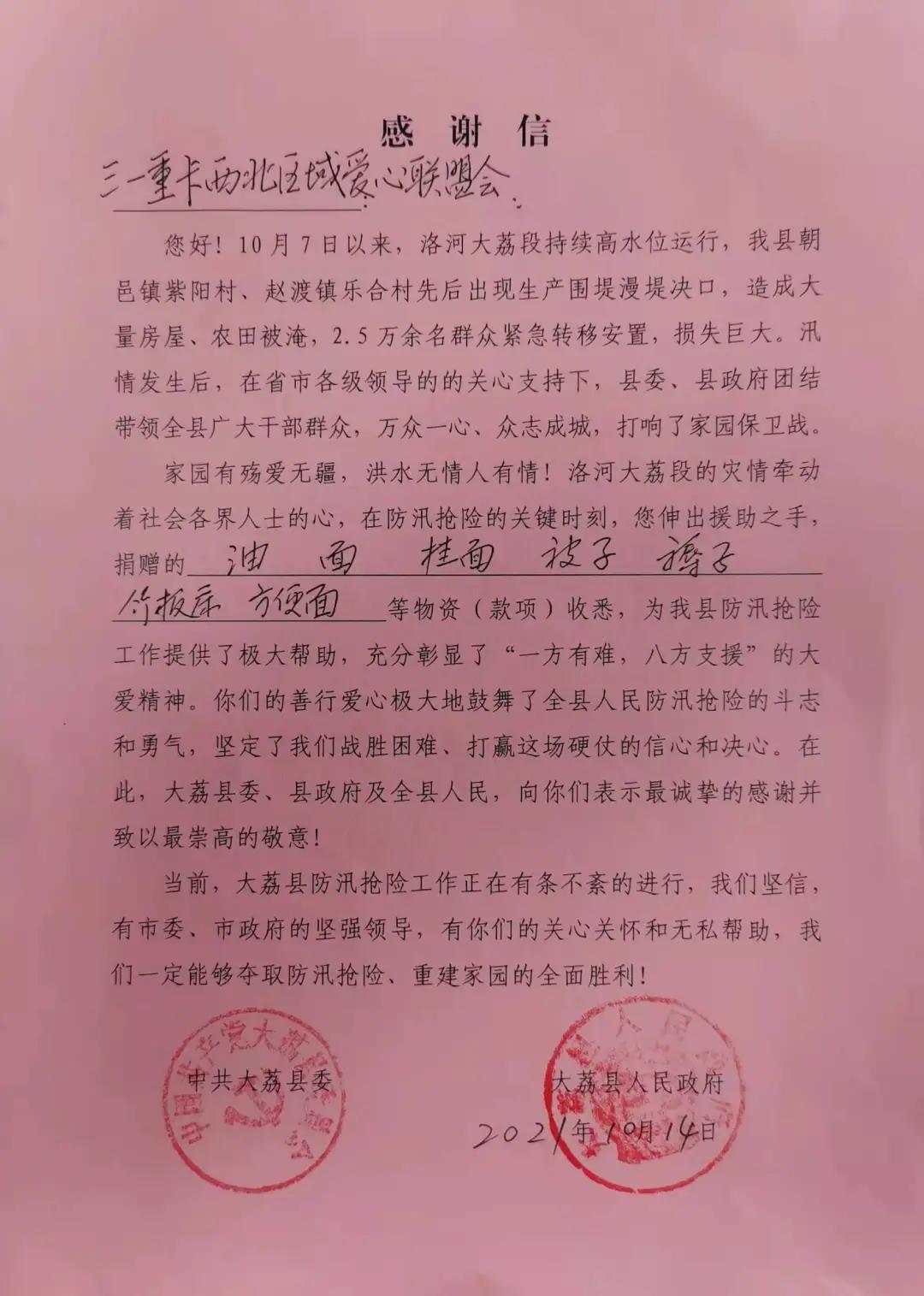中共大荔县委、大荔县人民政府的发来感谢信,诚挚感谢好体育投注网站重卡西北区域爱心联盟会的善举,感激联盟会在防汛抢险的关键时刻,伸出援助之手,无私帮助和关心关怀灾情和灾民情况。