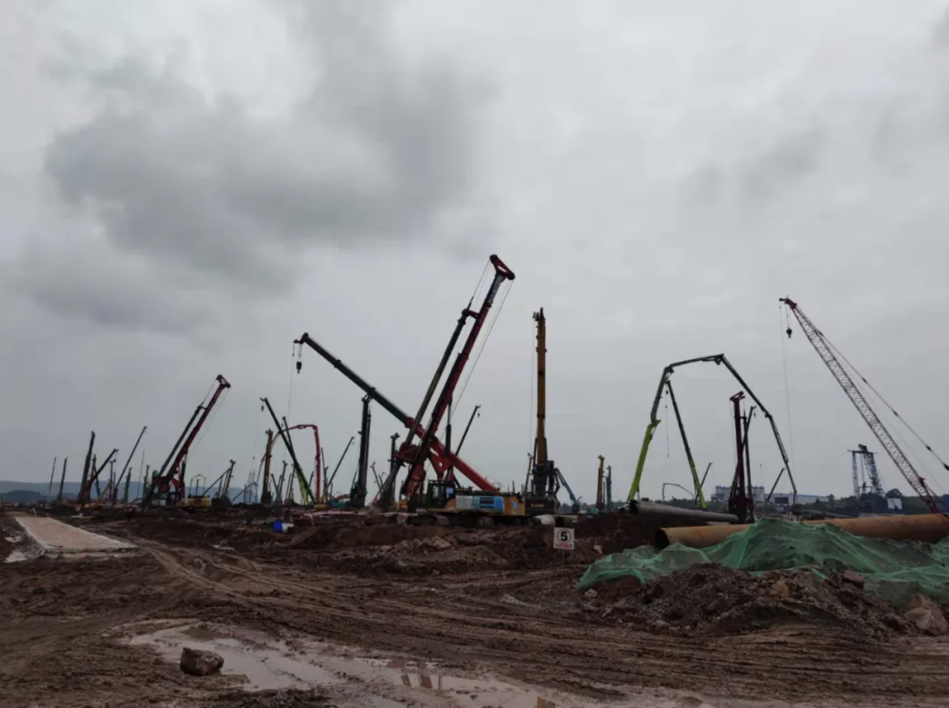 四川宜宾全球最大动力电池生产基地:时代吉利项目,其上部地层为杂填土,下部为强-中风化灰色泥岩,地下水较发育。由于任务重,工期紧,场地上共有40台旋挖钻机进行桩基础施工。令人遗憾的是,部分旋挖在使用双底捞砂斗钻进时,由于每天成桩数量十分有限,在试桩结束后被劝退离场。