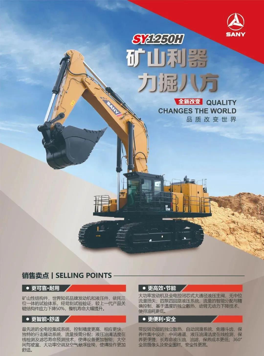 SY1250H继承大挖多年品质和技术积累沉淀,是主要为大型露天矿和土石方工程提供土方剥离、矿石采装开发的新产品,在可靠性、燃油消耗、作业效率、操控性、安全性、智能化等方面具备突出表现,必将改变中国100吨以上大型挖掘机依赖进口的态势。