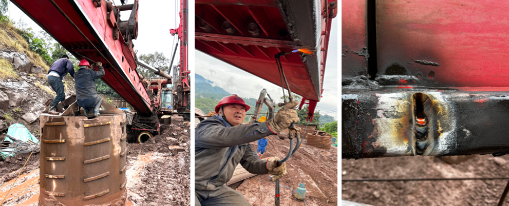 10月20日上午,我和喻以周老师前往工地。由于施工场地狭窄,一个桥梁承台上两台大型旋挖设备共同工作,一台挖机辅助施工,让本就狭小的空间更难施展开来。由于场地泥泞不堪,服务车根本不能进场,所以他使用的是工地上的电焊机,SR485为前趴机型,所以他不得不站在2米高的钻斗上焊接。先用割枪把裂缝割开,然后再进行焊接。他说为了桅杆不变形,轨道上必须先切割竖向焊缝,焊接好打磨平整,再切割其他两面,不然上桅杆的重量会把割出来的缝压缩导致桅杆变形。没想到喻以周老师不仅技术精湛,心还细!
