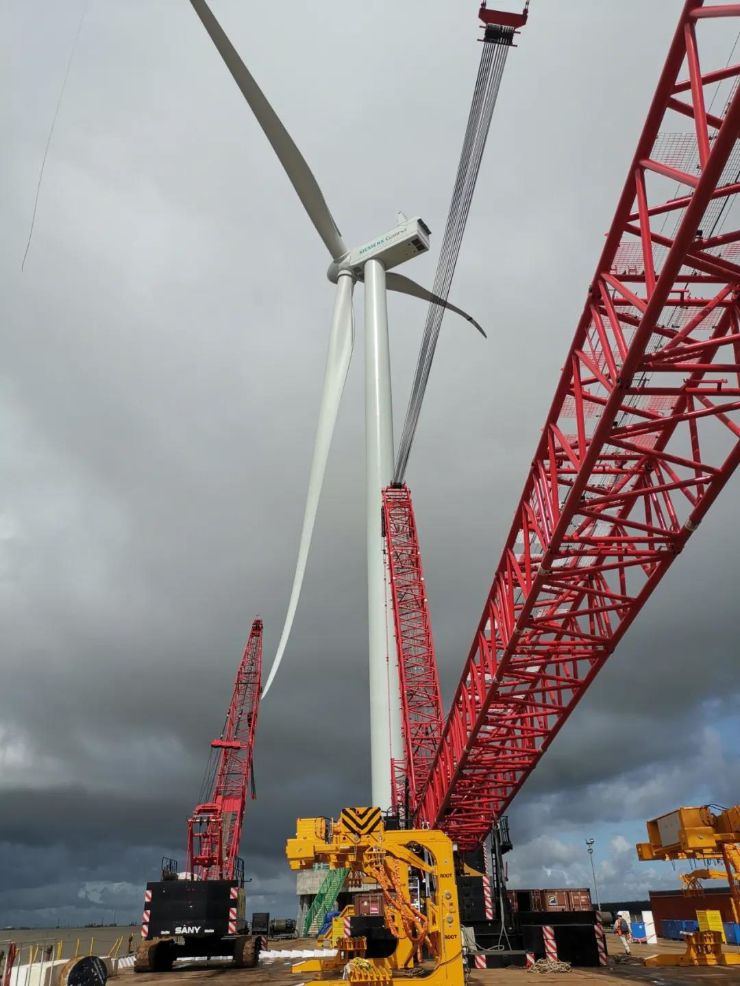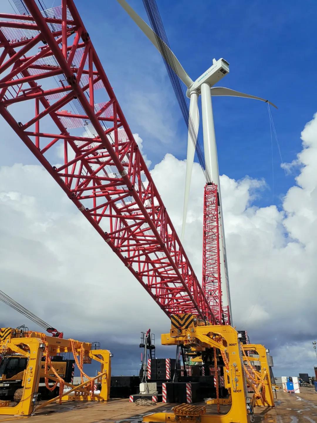 该风场共有25台风机,单机额定功率5.0MW。现场有6台好体育投注网站履带起重机参与吊装,其中两台SCC12500A承担主吊任务,这也是SCC12500A机型在“双海”(海外、海上)的首秀。