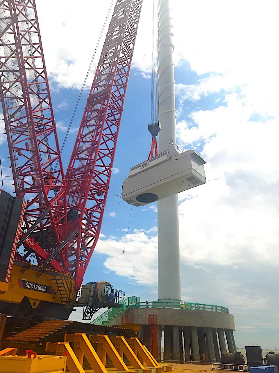 此次,SCC12500A采用HJDBC工况,臂长126米,工作半径16-32.5米,吊装高度约100米。机组功率高、机舱重。吊装机舱时,吊装重量(含吊具)共约180吨。