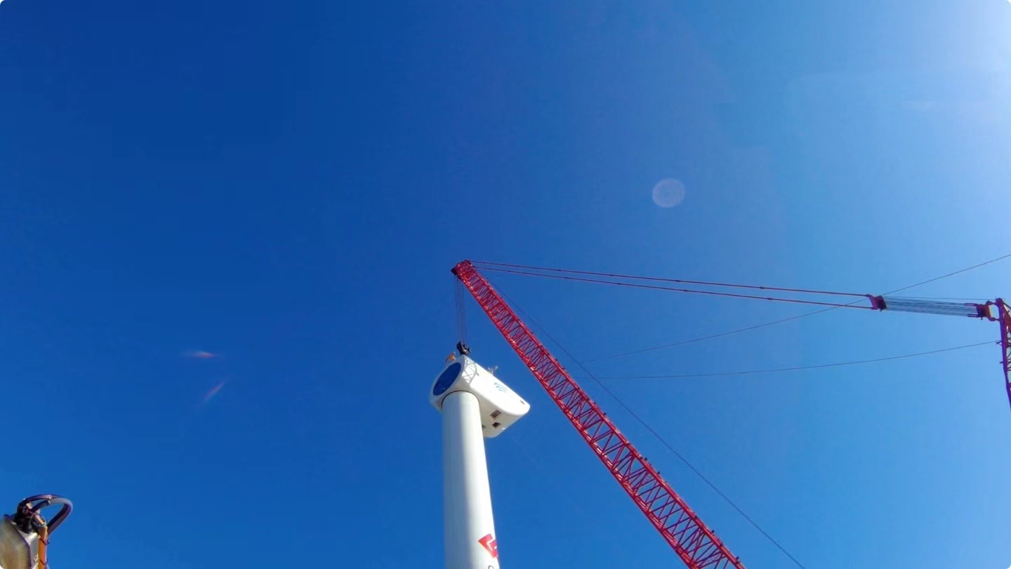耗费18个小时,连续吊完四节塔筒。下午三点正式上机舱,两个小时后,顺利压舱。但这里开始起风了,施工只能暂时停下来。
