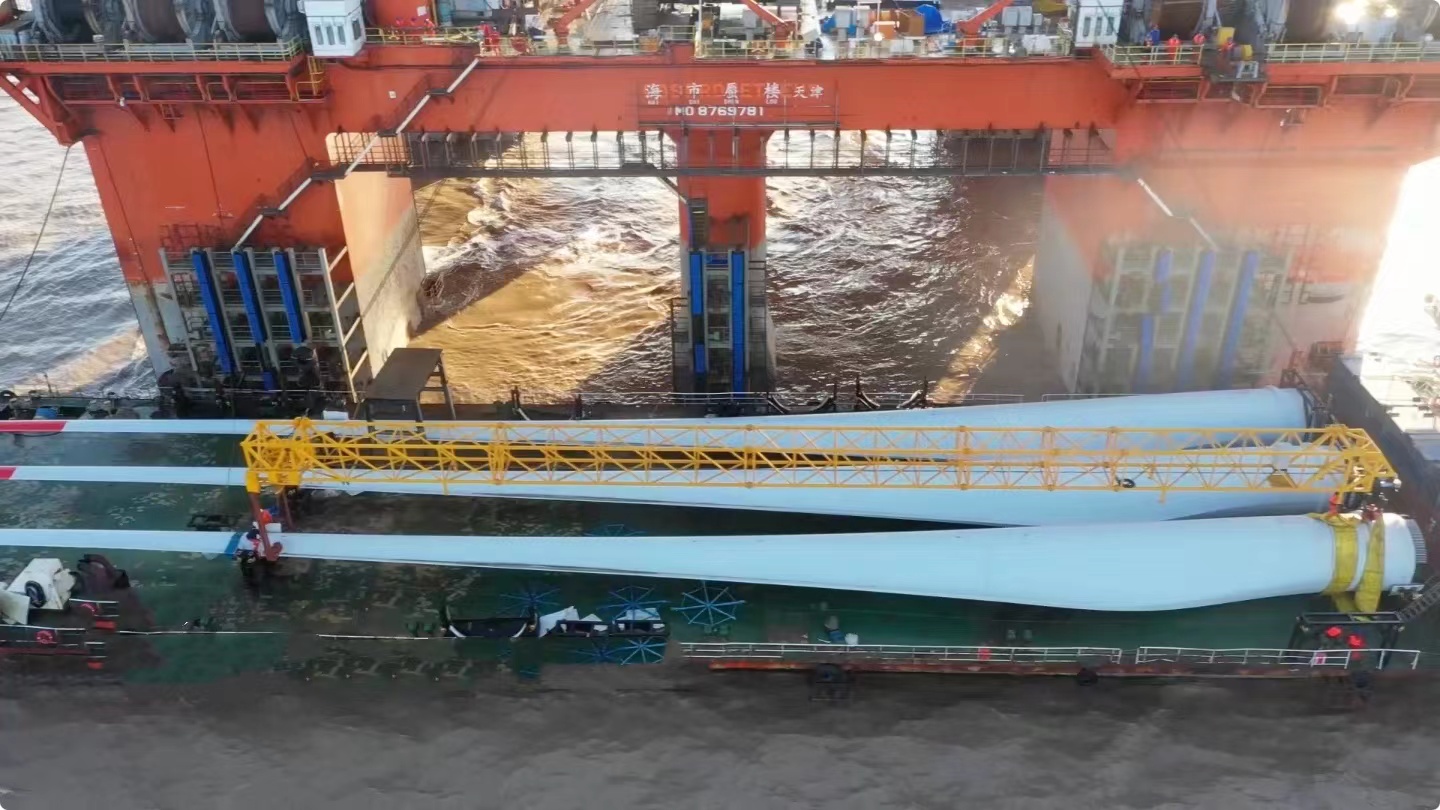下午风力减弱,是吊装的好时机,甲板的工人们忙活起来了,开始吊装发电机组。下午5点,货船载着三支叶片朝着平台驶来,但为了安全起见,工程师决定等风浪小了再吊装叶片。