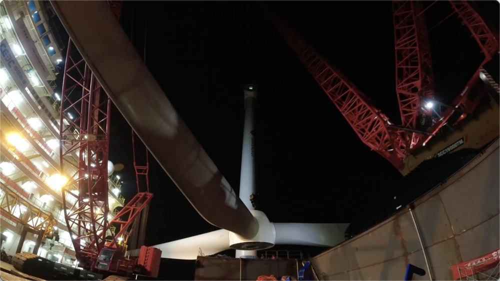 早上7点就开始进行第一支叶片组装,耗时13个小时全部组装完成。晚上9点,迎来了风机安装的最后一个步骤——叶轮整体吊装。