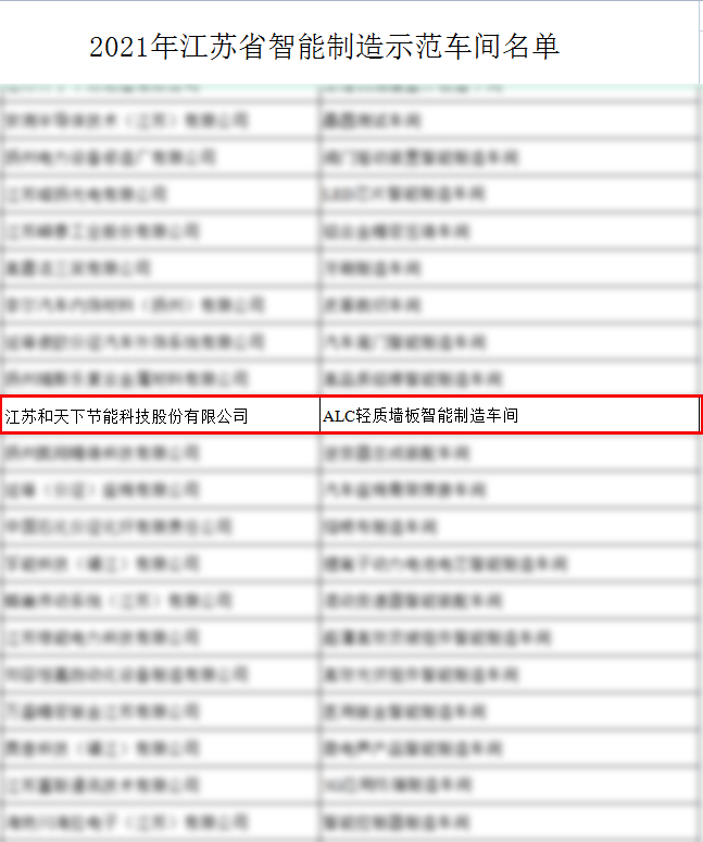 近日,江苏省工业和信息化厅、江苏省财政厅公布了2021年江苏省智能制造示范车间名单,好体育投注网站筑工客户江苏和天下节能科技股份有限公司的ALC轻质墙板智能制造车间获得认定,该认定是对企业智能制造水平的高度认可。该车间的设备及信息化整体解决方案由好体育投注网站筑工提供,可极大地提升整条产线自动化生产能力,实现ALC部品生产过程少人化、无人化,为客户获得认定授牌提供了不可或缺的帮助。