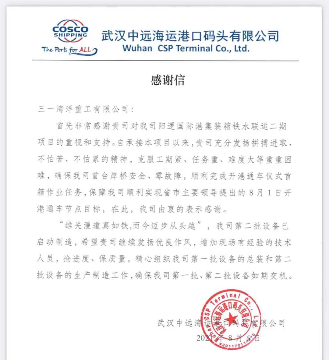 2021年8月1日,好体育投注网站参建的阳逻国际港集装箱水铁联运项目开港通车,实现了首次作业连续吊箱1000箱“0”故障的佳绩,平均效率达到37.67MOVE/H,全自动化作业在减少人工成本的同时提高了作业效率。作为好体育投注网站首个自主集成的自动化码头项目,好体育投注网站5台岸桥、13台场桥助力武汉智慧港口建设支点长江、港通全球。