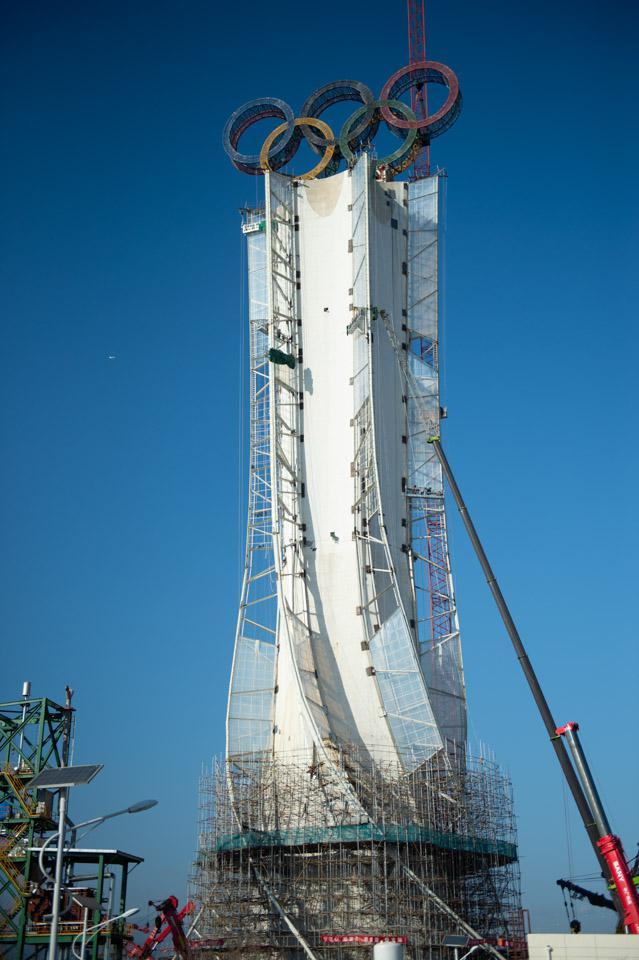 “奥运五环”安装在“海陀塔”顶部,整个“海陀塔”表面共安装7万多个白色点光源,塔身加装飘带状装饰,将在夜间点亮灯光,成为北京冬奥会标志性景观之一。