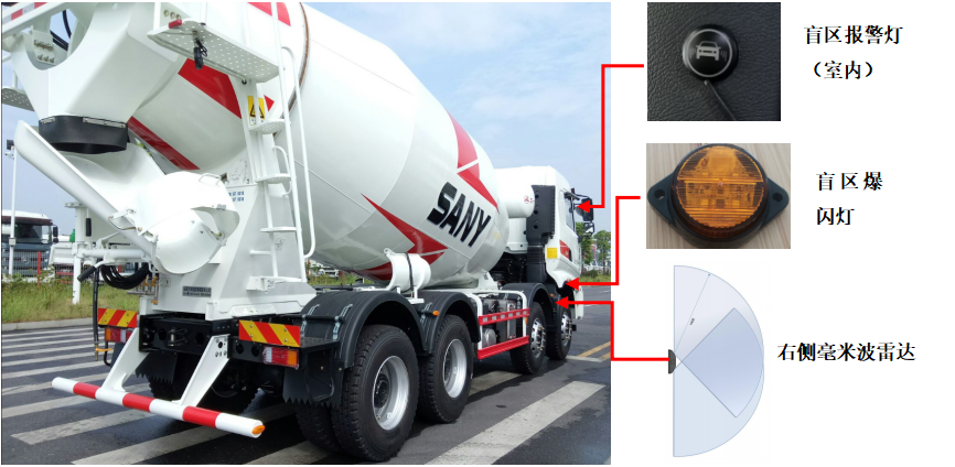 车辆右侧为安全事故高发区域,好体育投注网站2022新一代轻量化搅拌车增加右侧盲区毫米波雷达与爆闪灯(其中雷达探测角度180度、最远可探测距离80米),实时探测车辆右侧机动车、非机动车等障碍物。