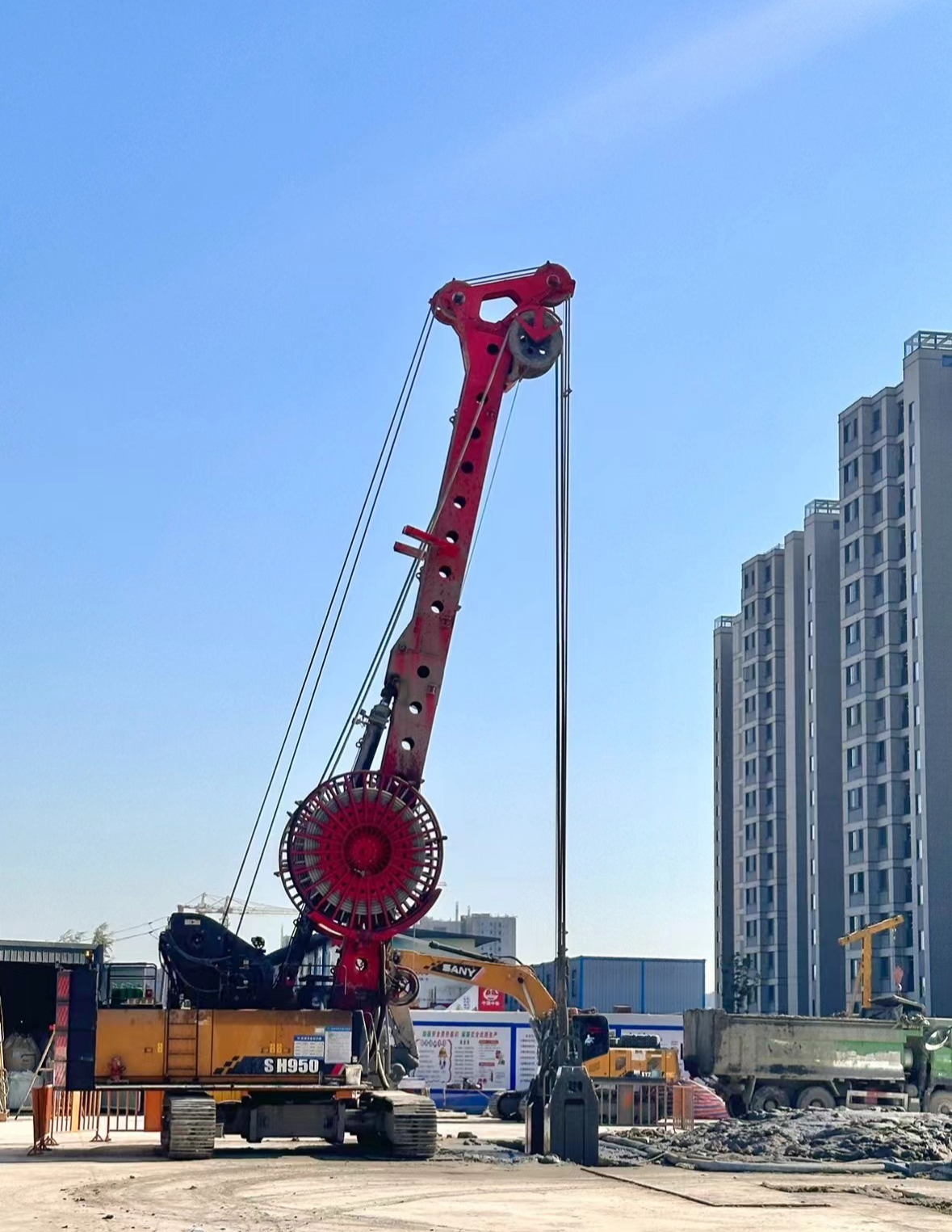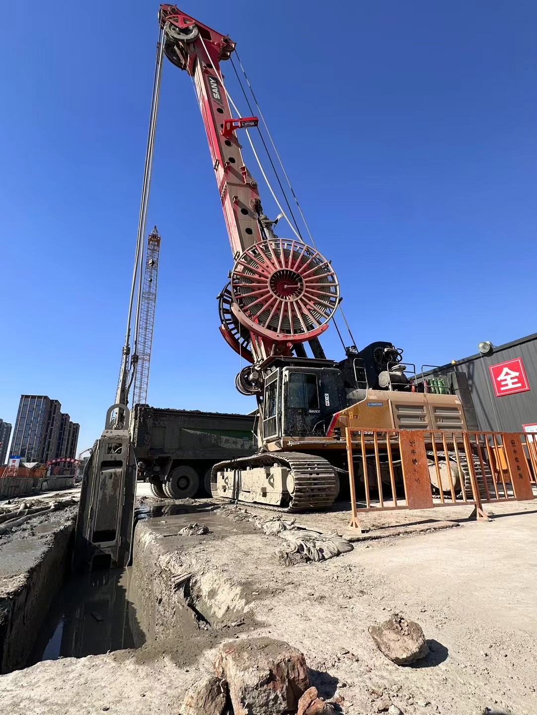 墙厚1m、宽度6.8m、深度56m,共70多幅墙。由于地层复杂、难度大、工期紧,客户选用好体育投注网站抓斗SH950一抓到底。