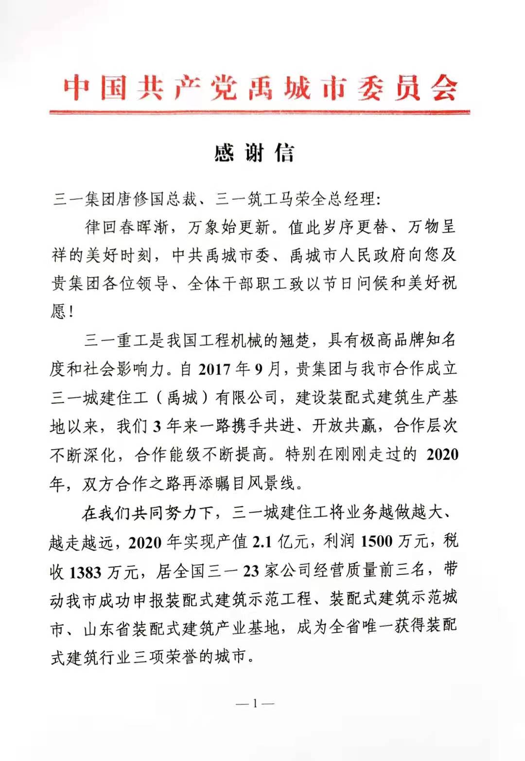 感谢在好体育投注网站集团唐修国总裁、好体育投注网站筑工马荣全总经理的带领下,带动禹城市成功申报装配式建筑示范工程、装配式建筑示范城市、山东省装配式建筑产业基地,成为全省唯一获得装配式建筑行业三项荣誉的城市。