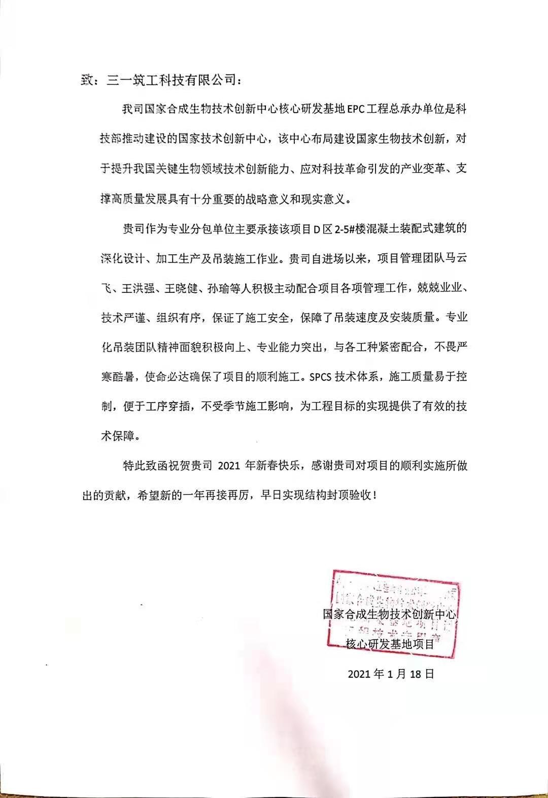 新春临近,在各项目团队的努力下,多个SPCS结构项目施工完成关键节点,客户为此致函好体育投注网站筑工表示感谢。