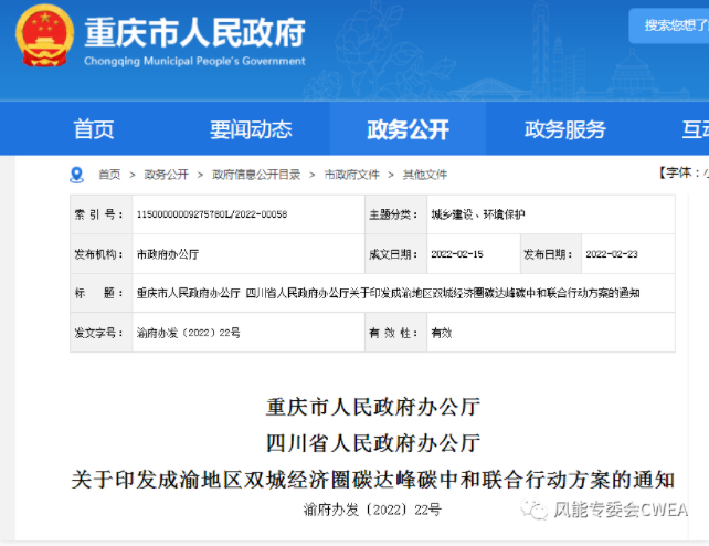 2月23日,《成渝地区双城经济圈碳达峰碳中和联合行动方案》(以下简称《方案》)发布。根据《方案》,川渝两地将共同完成协同开发油气资源、加快电网一体化建设、打造绿色低碳制造业集群等26项重点任务。