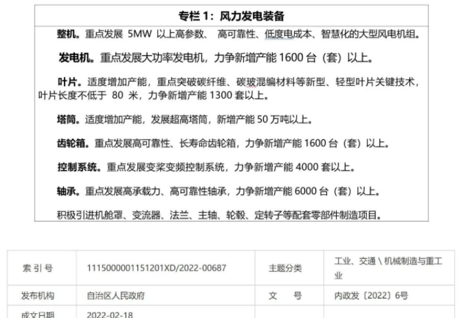 加快现有产能升级改造,优化产品结构,提升整机产能利用率。适度发展风电整机制造,重点发展叶片、发电机、增速机、轮毂、主轴、定转子、法兰、轴承、控制系统等核心配套零部件,提高零部件配套能力,着力打造风电装备制造全产业链,基本形成与新增新能源装机规模相匹配的风电装备生产能力,努力建设我国北方重要的风力发电装备制造基地。