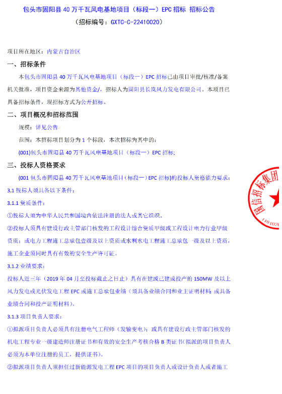近日,包头市固阳县40万千瓦风电基地项目(标段一)EPC招标公告发布。根据公告,包头市固阳县40万千瓦风电基地项目位于内蒙古自治区包头市固阳县境内。风电场拟采用80台单机容量5.0MW的风电机组布置方案,其中西部场区布置32台,容量160MW,东部场区布置48台,容量240MW,整个场区总容量400MW,新建220kV升压站一座,新建220KV送出线路一回。