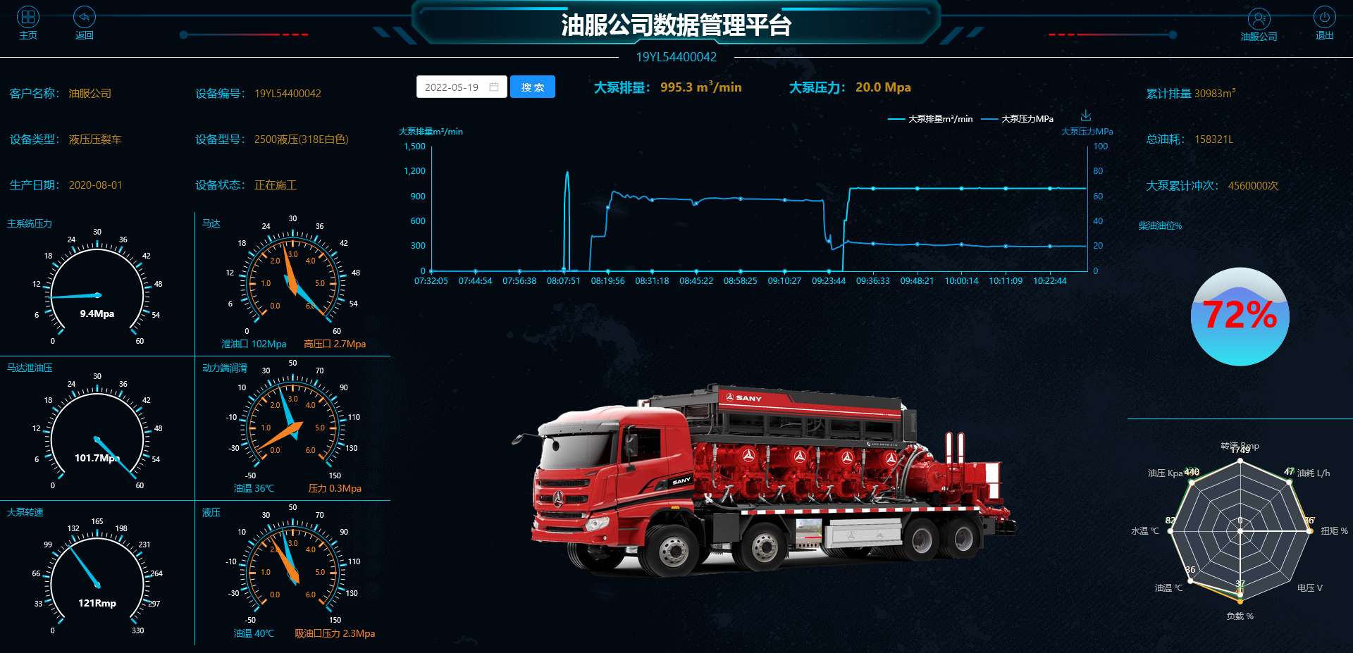 三是施工管理:施工管理可以查看客户施工曲线,包括开工率、工作时长、液量、油耗等。维保管理可以查看设备待保养信息与已保养信息,设备报警信息与已处理报警信息。客户可以查看施工曲线,并可以根据日、周、月进行切换选择,根据施工曲线掌握生产情况并作出调整。