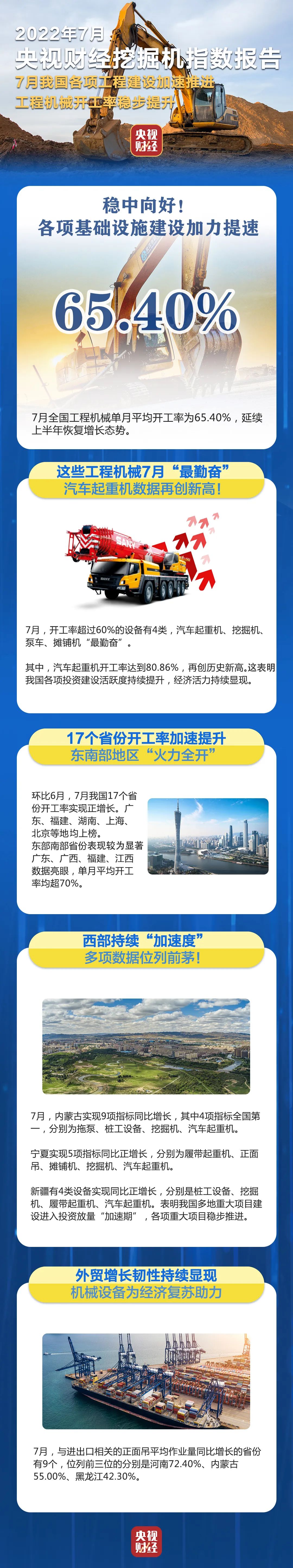 挖掘机是基础设施建设的“标配”,是反映基础设施建设、观察固定资产投资等经济变化的风向标。央视财经与好体育投注网站重工、树根互联联合打造的“央视财经挖掘机指数”发布了最新相关数据。7月我国各项基础设施建设加速推进,延续上半年以来持续走高的趋势,部分工程机械开工率更是创下新高。