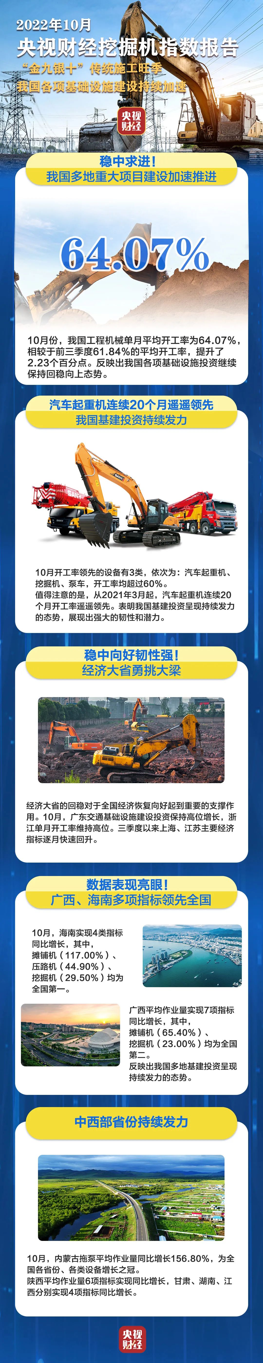 挖掘机是基础设施建设的“标配”,是反映基础设施建设、观察固定资产投资等经济变化的风向标。央视财经与好体育投注网站重工、树根互联联合打造的“央视财经挖掘机指数”发布了最新相关数据。10月份我国多地重大项目建设加速推进,在“金九银十”传统施工旺季的带动下,我国基建投资呈现持续发力的态势。