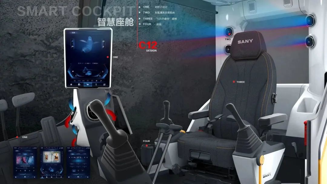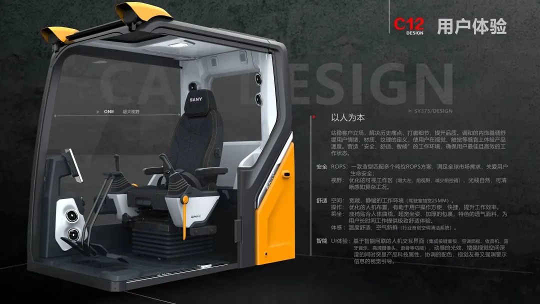 站稳客户立场,解决历史痛点,打磨细节,提升品质。调和的内饰基调舒缓用户情绪,材质、纹理的定义,使用户在视觉、触觉等感官上体验产品温度。营造“安全、舒适、智能”的工作环境,确保用户高效的工作状态。