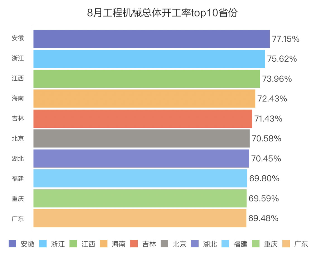 8月,安徽、浙江工程机械开工率拿下全国前二,分别为77.15%、75.62%。