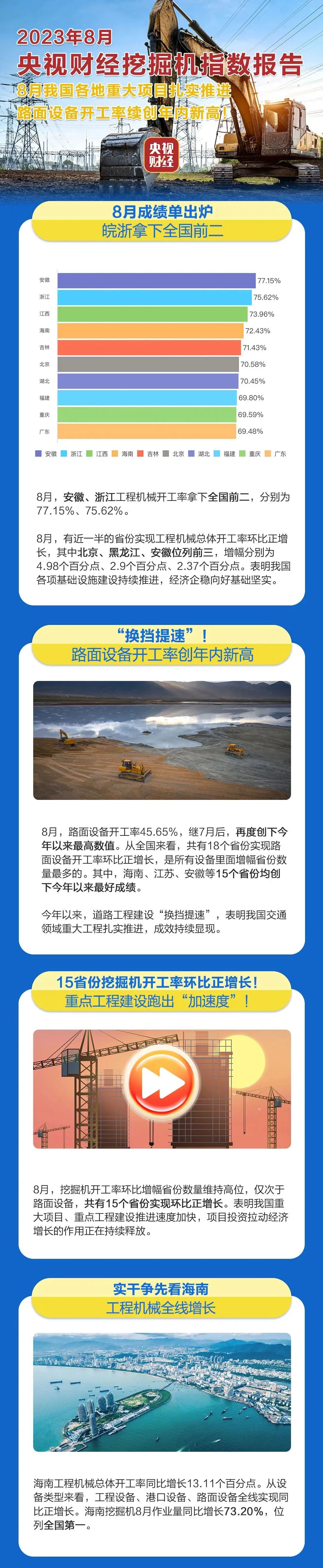 海南工程机械总体开工率同比增长13.11个百分点。从设备类型来看,工程设备、港口设备、路面设备全线实现同比正增长。海南挖掘机8月作业量同比增长73.20%,位列全国第一。