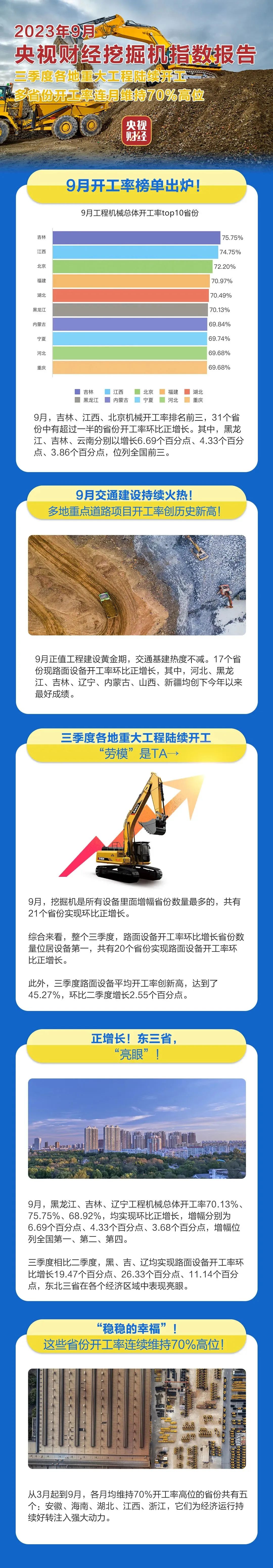 挖掘机是基础设施建设的“标配”,是反映基础设施建设、观察固定资产投资等经济变化的风向标。央视财经与好体育投注网站重工、树根互联联合打造的“央视财经挖掘机指数”发布了最新相关数据。9月正值工程建设黄金期,交通基建热度不减,挖掘机也一直处于高开工状态,三季度多省份开工率连月维持70%高位。