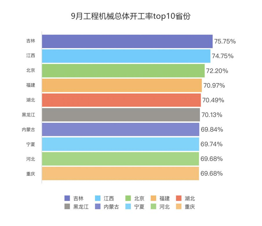 9月,吉林、江西、北京机械开工率排名前三,31个省份中有超过一半的省份开工率环比正增长。其中,黑龙江、吉林、云南分别以增长6.69个百分点、4.33个百分点、3.86个百分点,位列全国前三。