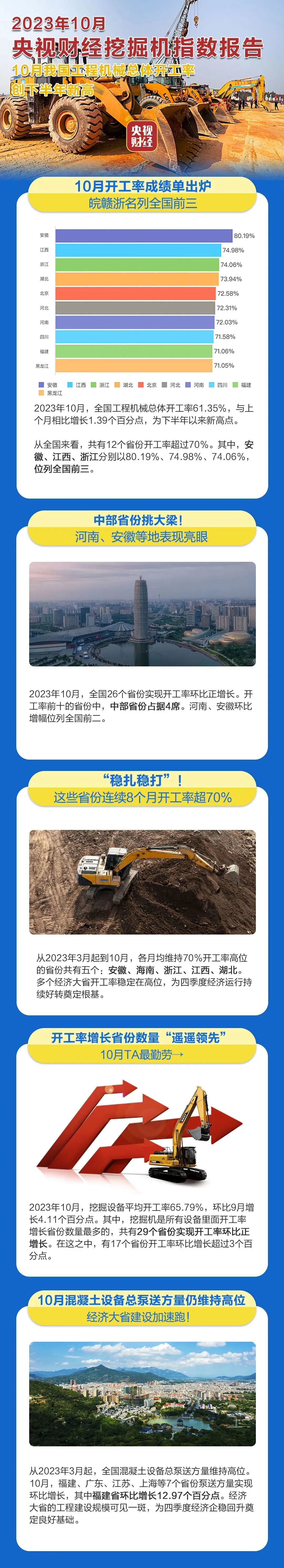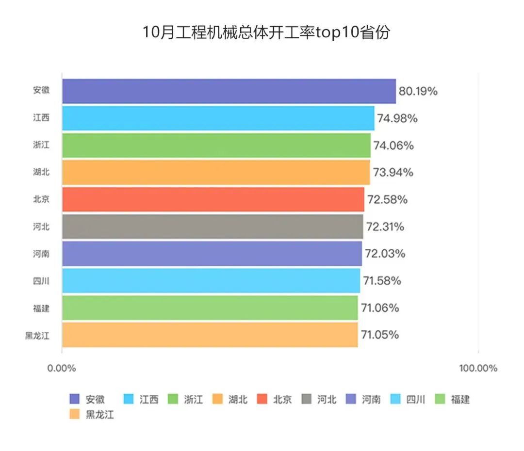 10月开工率成绩单出炉皖赣浙名列全国前三2023年10月,全国工程机械总体开工率61.35%,与上个月相比增长1.39个百分点,为下半年以来新高点。从全国来看,共有12个省份开工率超过70%。其中,安徽、江西、浙江分别以80.19%、74.98%、74.06%,位列全国前三。今年上半年,安徽曾连续5个月开工率全国第一。