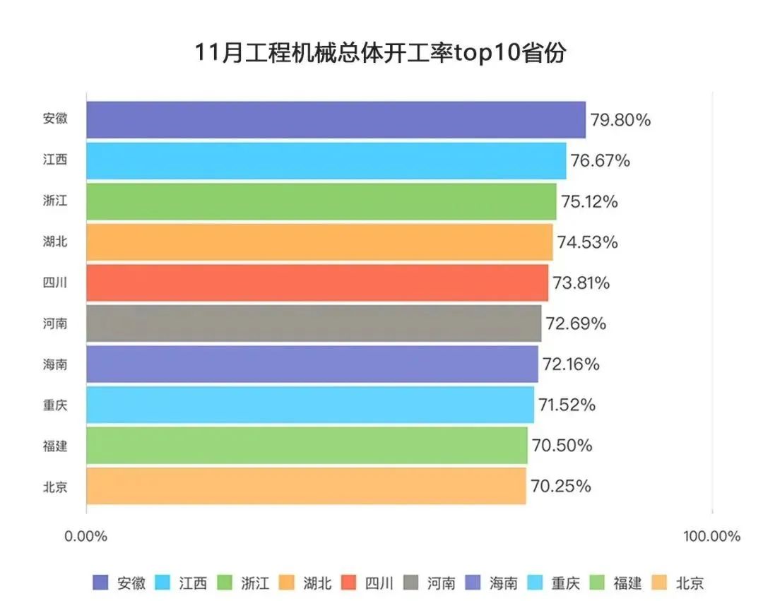 11月,安徽、河南、湖北各有7类设备平均作业量同比增长,江西有3类设备平均作业量同比增长,主要集中在汽车起重机、履带起重机、挖掘机。