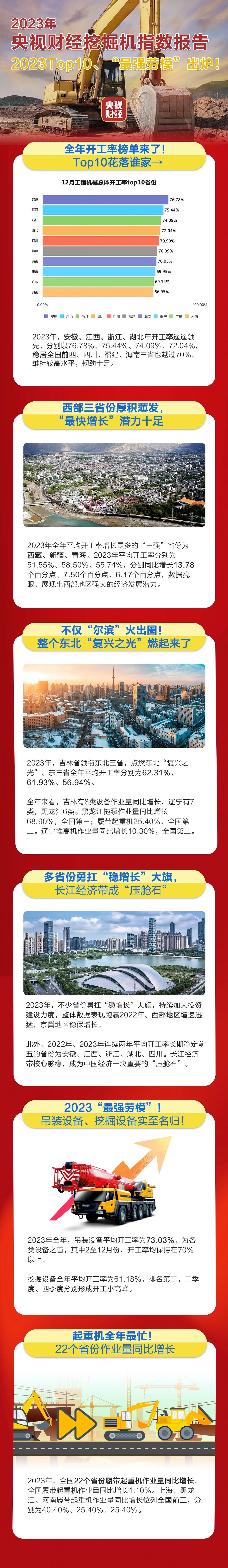挖掘机是基础设施建设的“标配”,是反映基础设施建设、观察固定资产投资等经济变化的风向标。央视财经与好体育投注网站重工、树根互联联合打造的“央视财经挖掘机指数”发布了最新相关数据。2023年全国工程机械开工率为58.57%,各项基础设施建设稳中向好,不少省份勇扛“稳增长”大旗,整体数据表现跑赢2022年。